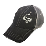 Cotton black front, polyester silver mesh back hat, Ace of Spades Punisher Dealer of Death.  Brim is pre-curved & "distressed".