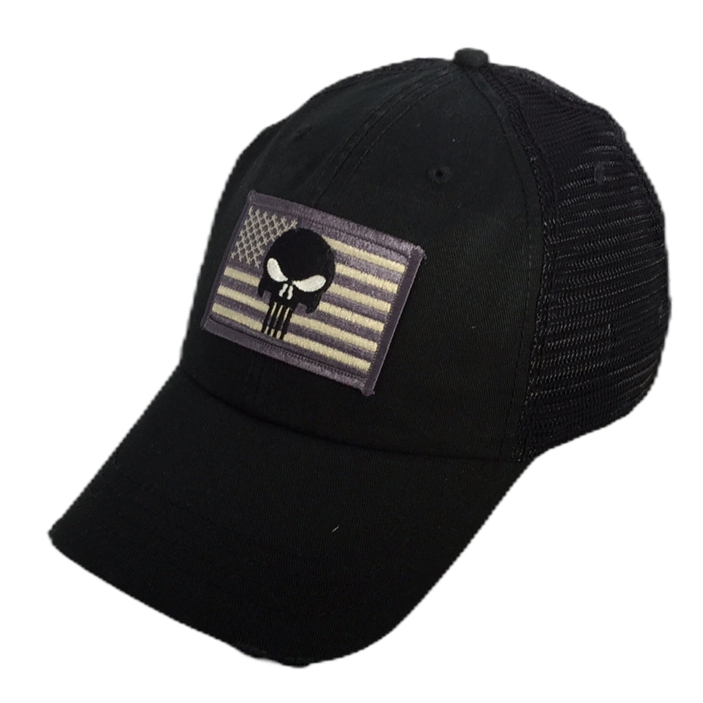 Black front and black polyester mesh back, with a Punisher / US Flag patch permanently fixed on the front. Bill on the front is pre-curved and "distressed".